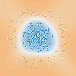Here are the default Playground settings modified so that the regularization rate is a relatively high 0.1. The net usually isn't able to learn anything with the regularization set this high, and all the weights get zeroed out. But now try pressing "play" with the default settings unmodified, and adjust the regularization rate to 0.1 once a circle has been learned. You should get a nice faded circle shape: